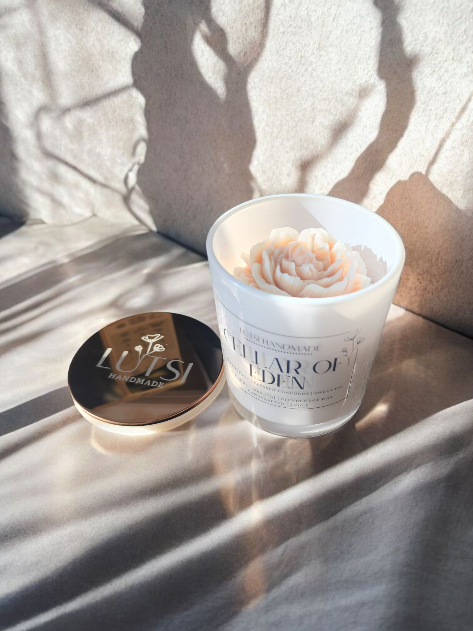 Topped with our signature wax peony, Cellar of Eden invites you into a hidden orchard at the height of its bloom. Juicy pear, sun-warmed concord grapes, and luscious sweet figs intertwine to create a fragrance that is both decadent and divine—lush, golden, and irresistibly feminine.