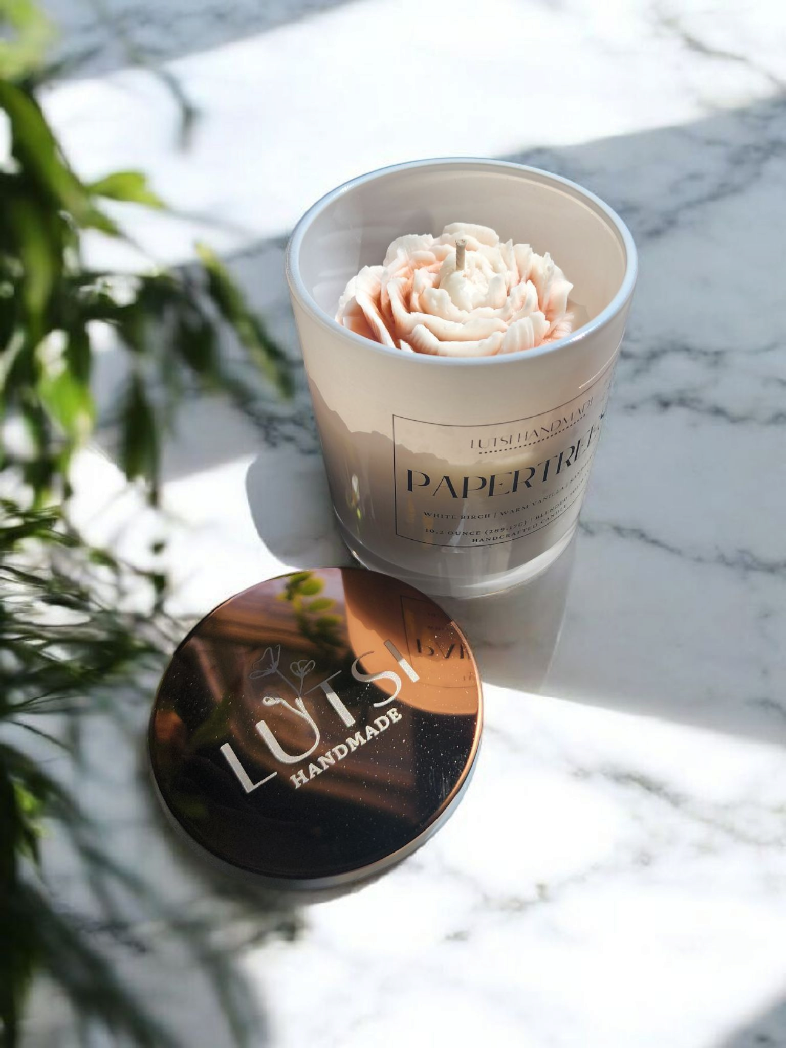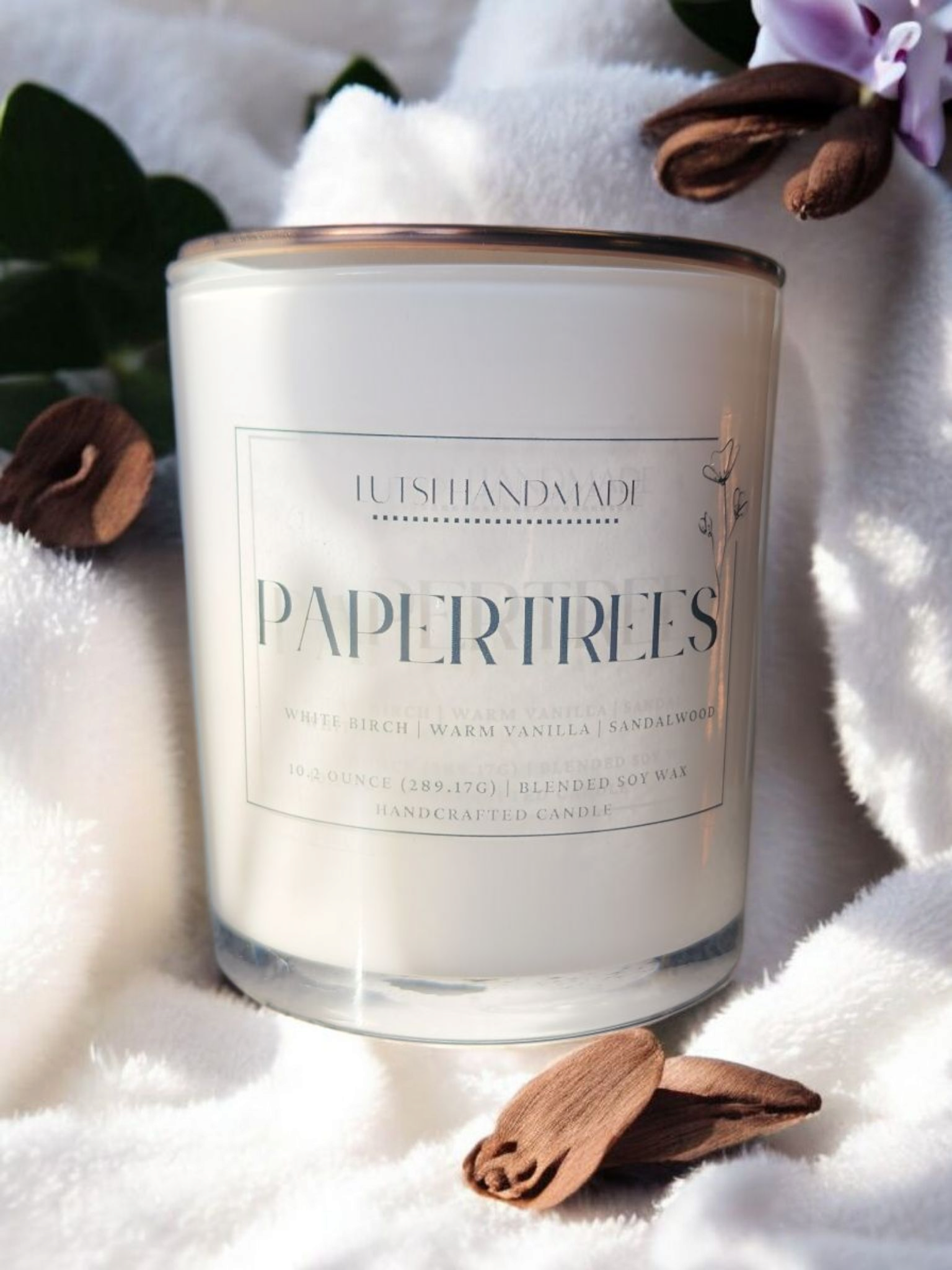 Adorned with our signature wax peony, Papertrees is a quiet moment wrapped in warmth. Creamy vanilla drifts through the crisp clarity of white birch, settling into the soft embrace of smooth sandalwood. It’s a scent that feels like pages turning in a well-loved book—clean, comforting, and gently grounding.